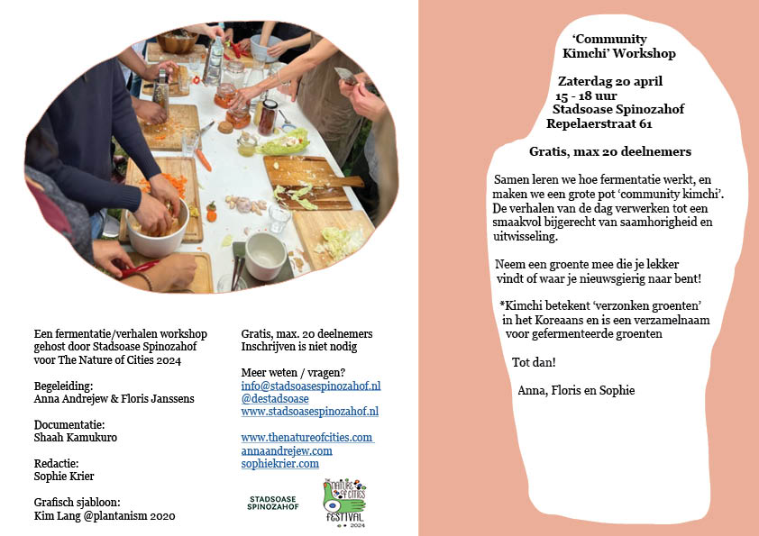 In the opening circle we will see what everyone has brought. Then we get to work making a “community kimchi”. As we make, we share stories about the veggie we brought along. We might ask: what associations do you have with it? Did your grandmother often prepare it? Is it a veggie you don’t really know how to eat/process? While cutting, we will prepare a big pot of ‘community kimchi’, which will incorporate the stories of the day into a dish of togetherness and sharing. The community kimchi* will remain stored at Spinozahof so its nutrients and stories can be tasted during future gatherings.