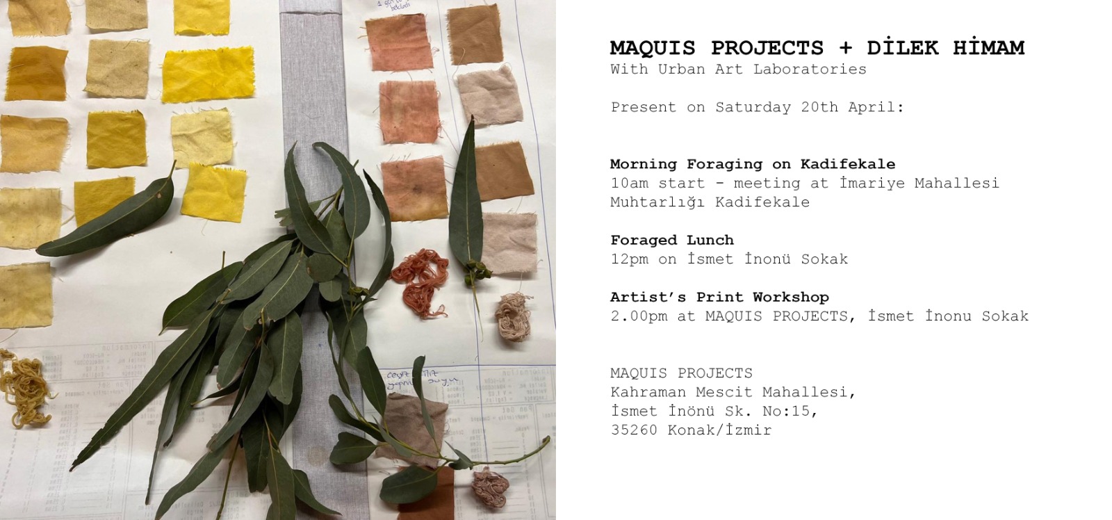 The Maquis foraging walk goes from Kadifekale through parks and community gardens, along old city walls, past the castle and the old roman theater, through the old Ottoman historic streets, near ancient ochre sources of Smyrna, over a buried river, under a motorway and finally ends at the Maquis Projects space on Ismet Inonu Sokak where we will use the collected plants to make a shared meal. On this walk we will revert to the ancient role of food gathering from the plants growing around us.