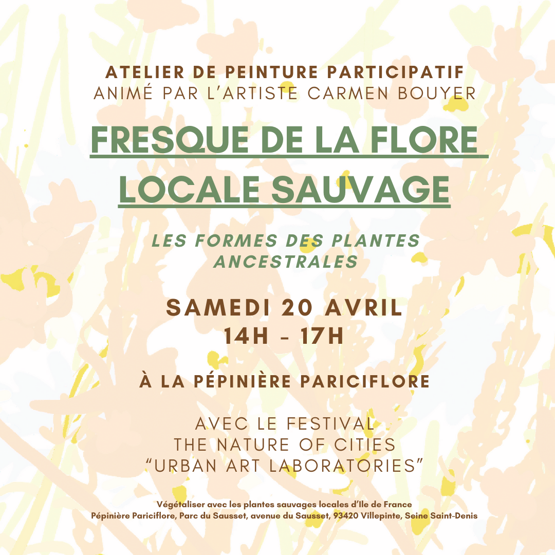 Creation of a collective fresco representing a selection of local wild plants of the Paris region guided by artist Carmen Bouyer. We’ll use natural pigments derived from soil and plants to paint on a container at the Pariciflore nursery in Seine Saint-Denis. Participants will also take part in the nursery’s activities: transplanting, gardening, weeding during the workshop. Pariciflore is the first and unique nursery in the Paris region cultivating local wild plants for people and communities to green urban and peri-urban spaces. The association aims to help maintain local biodiversity by promoting wild flora and developing the production of wild plants and seeds. Local wilds have been growing in the region for more than 400 years, this workshop wishes to honor them through art and community.